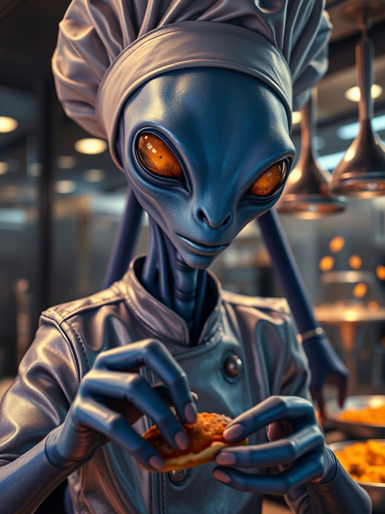 Each chef stands at an impressive height of over seven feet, their elongated limbs allowing them to multitask in ways that would make even the most seasoned Earth-based cooks jealous. Imagine one arm flipping patties on a floating grill while another garnishes a salad, and yet another operates holographic controls—all simultaneously. Their movements are fluid and precise, almost choreographed, suggesting years (or perhaps centuries) of practice in zero-gravity cooking environments. It’s no wonder they can churn out meals so efficiently, despite the challenges posed by space.