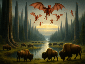 - Animals resembling bison, goats, and unicorns grazing peacefully.